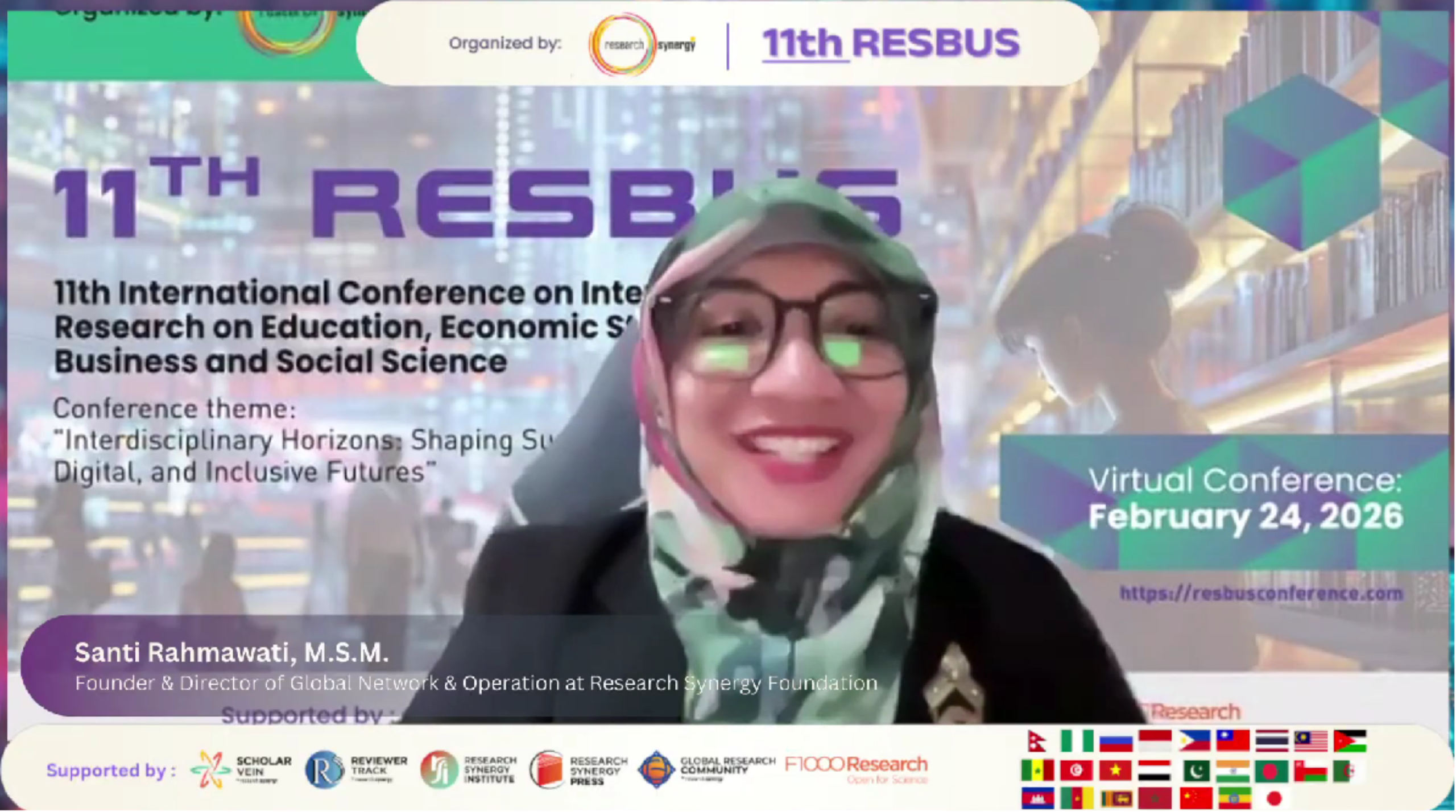 The 11th International Conference on Interdisciplinary Research on Education, Economic Studies, Business and Social Science (11th RESBUS) was successfully conducted on February 24, 2026, in a fully virtual format via Zoom (UTC+7, Jakarta Time). Organized by Research Synergy Foundation, this annual conference once again served as a dynamic global platform for academics, researchers, scholars, and professionals to exchange ideas, present research findings, and strengthen interdisciplinary collaboration across education, business, economics, technology, and social sciences .